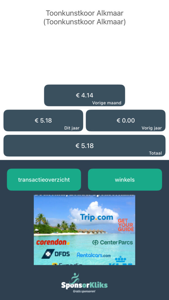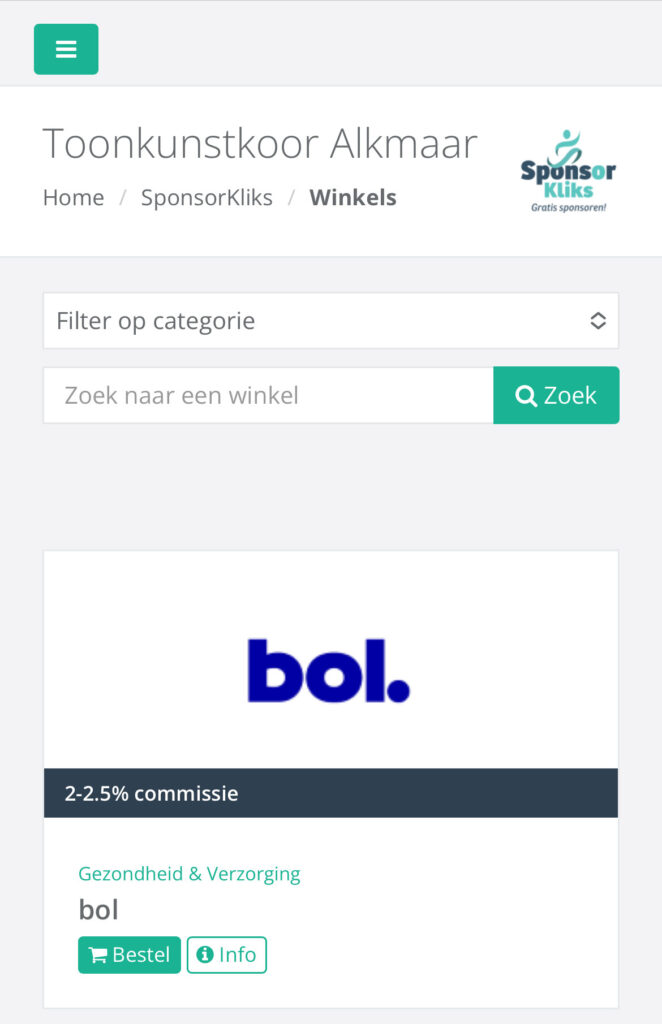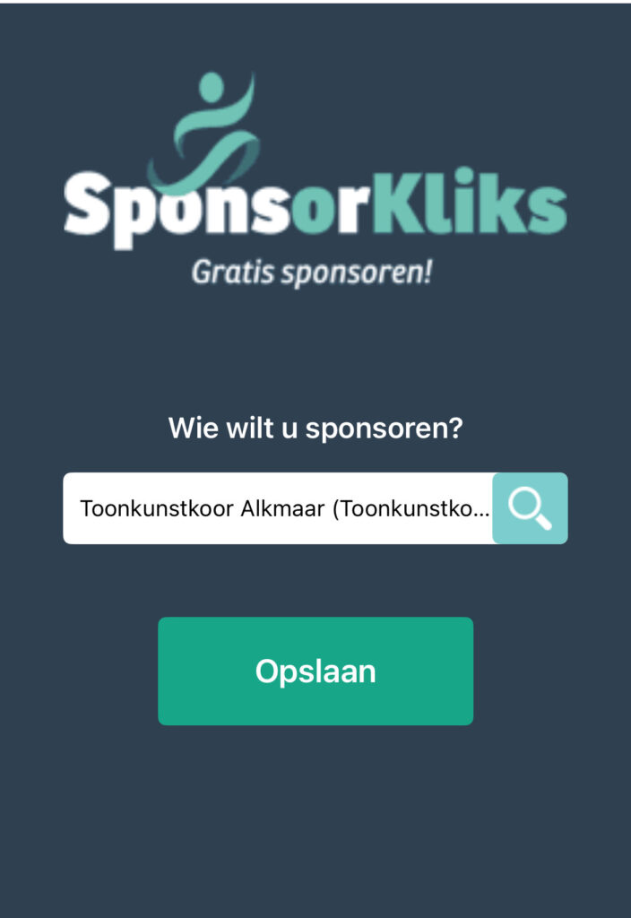 De app is beschikbaar voor Android en Apple. Nadat je de app hebt geïnstalleerd selecteer je ‘Toonkunstkoor Alkmaar’ en slaat deze op. Elke keer als je in de app van SponsorKliks naar een winkel gaat, weet SponsorKliks dat de commissie naar Toonkunstkoor Alkmaar moet gaan.